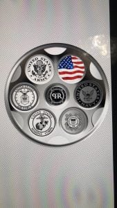 We started working on a revolver feel on the back of the coin, we removed the flag background and put it into on the chambers and added the branched around. We removed the QRC code and inserted our logo, as a guide rod holder. At this point, we were contemplating, should we make the backspin like a regular revolver. We thought it would be a very cool feature of the coin, basically, you never know which chamber you’re going to get when you start messing with a bunch of kickass veteran business owners! We moved away from this design because we were asked to incorporate the sponsors of the event into the back of the coin and in a revolver setting we would not be able to do each one justice.