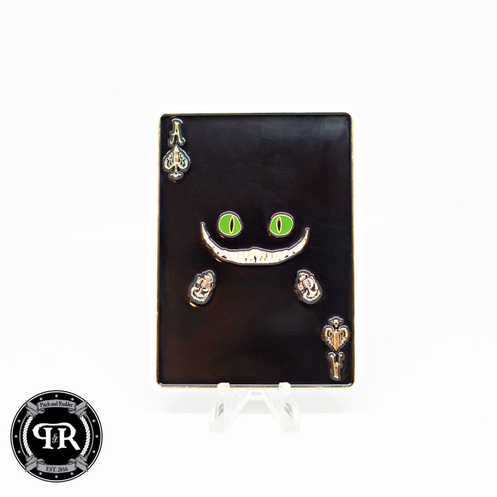 Cheshire Cat Challenge Coin is cut straight from Queen’s garden! Aces are wild! This iconic playing card coin has the glowing eyes and Navy Chief Anchors…. What’s not to love!