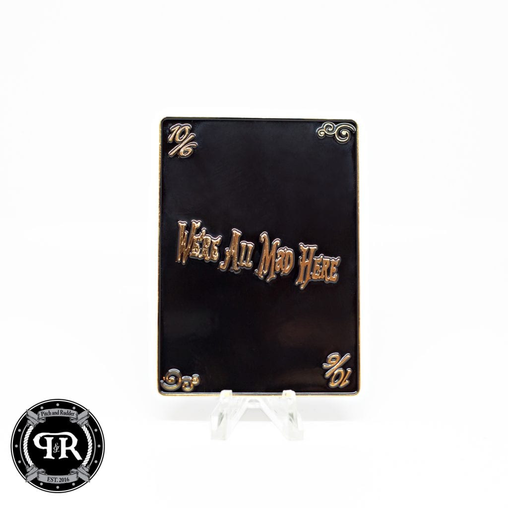 Our Cheshire Cat Challenge Coin is cut straight from quean garden! Aces are wild! This iconic playing card coin has the glowing eyes and Navy Chief Anchors…. What’s not to love!