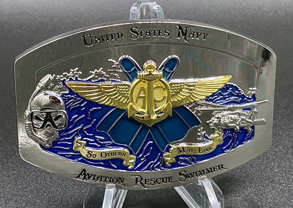 Our SAR buckle features the golden Naval Air Crew wings, dive fins, skull diver mask, and helicopter over water all in 3d.  With “So Others May Live”.   Search and Rescue needed a belt buckle that looks as elite as they are and I think we nailed it.