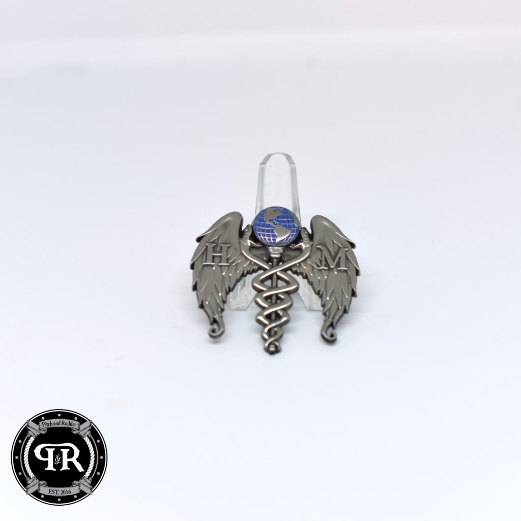 Wear your pin with pride knowing we own all that the sun touches on the flight line! Know that in your hands you have a product that’s designed by a team of Active Duty and Retired Senior Chiefs. We designed with you in mind! Our HM lapel pin is a small pin that can be worn on clothing, often worn on the lapel of a jacket or a hat. Sometimes called a hat pin, Pitch and Rudders HM Lapel pin is designed to be worn to indicate wearer’s affiliation as a Hospital Corpsman in the U.S. Navy. Pitch and Rudders HM Hat pin come in two different variations, one with a globe and fanged snakes with angel wings and the other as a standard Naval rate emblem.